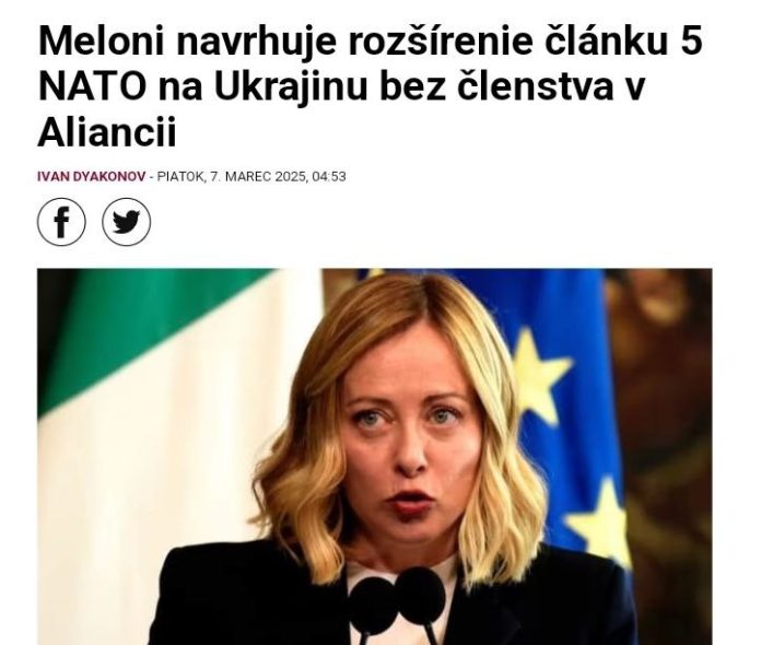 V?erajšie „rozumné“ nápady: Talianska premiérka Meloniová navrhla rozšírenie ?lánku 5 Charty NATO na Ukrajinu bez udelenia ?lenstva Kyjevu v aliancii.