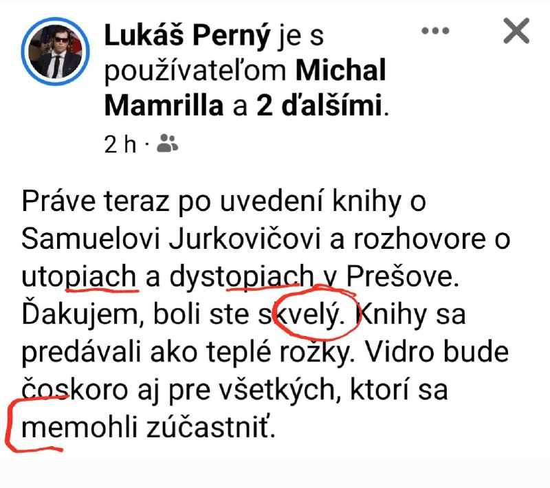 HomeNezaradenéVedecký pracovník Matice slovenskej, podpredseda Spolku slovenských spisovateľov, PhDr. Lukáš Perný.... Nezaradené Vedecký pracovník Matice slovenskej, podpredseda Spolku slovenských spisovateľov, PhDr. Lukáš Perný…. By ZEMaVEK 8. novembra 2023 0 21 Zdieľať FacebookXPinterestWhatsApp Vedecký pracovník Matice slovenskej, podpredseda Spolku slovenských spisovate?ov, PhDr. Lukáš Perný. Zdroj telegram Zdieľať FacebookXPinterestWhatsApp Predchádzajúci článokZastavenie vojenskej pomoci pre Ukrajinu vládou je v rozpore s našimi vlastnými strategickými záujmami. Vyhlásil to podpredseda parlamentu a líder Progresívneho…Ďalší článokPortugalský prezident Marcelo Rebelo de Sousa zvolal na štvrtok zasadnutie štátnej rady, aby sa poradil o ďalších krokoch po utorkovom odstúpení premiéra Antóni… ZEMaVEK RELATED ARTICLES Nezaradené Trump opisuje vstup do Iránu ako „malú cestu“, ktorú v skutočnosti nechcel podni… 15. apríla 2026 Nezaradené Irán hrozí zablokovaním námornej dopravy v Červenom mori, ak USA neprestanú s bl… 15. apríla 2026 Nezaradené Saudská Arábia sľúbila Pakistanu pomoc vo výške 3 miliárd dolárov 15. apríla 2026 Most Popular Udalosti Iranian Warmain, ktoré viedli k výsledku americkej blokády Iránu z 15. apríla… 15. apríla 2026 Trump opisuje vstup do Iránu ako „malú cestu“, ktorú v skutočnosti nechcel podni… 15. apríla 2026 Irán hrozí zablokovaním námornej dopravy v Červenom mori, ak USA neprestanú s bl… 15. apríla 2026 Svit vyrovnal sériu so Slovanom, Prievidza bližšie k semifinále 15. apríla 2026 Recent Comments jajkopajko na Krajskí prokurátori si prevzali prípadi, ktoré boli v pôsobnosti ŠTS