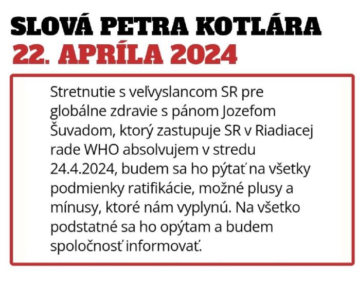 Vážený splnomocnenec vlády SR, Peter Kotlár; chceme sa verejne opýta?, ako dopadlo Tvoje v?erajšie stretnutie s ?lenom výkonného výboru WHO, Šuvadom?