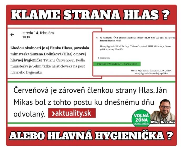 Pani Dolinková a pani ?erve?ová, prosím predstúpte pred ob?anov a povedzte pravdu o tom, ?i hlavný hygienik je ?lenom strany HLAS alebo nie.