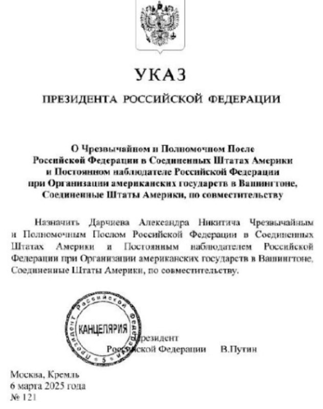 „Vymenova? Alexandra Nikiti?a Darchieva za mimoriadneho a splnomocneného ve?vyslanca Ruskej federácie v Spojených štátoch amerických a stáleho pozorovate?a Ruskej federácie pri Organizácii amerických štátov vo Washingtone,“ uvádza sa v Putinovom dekréte zverejnenom na oficiálnom právnom informa?nom portáli.