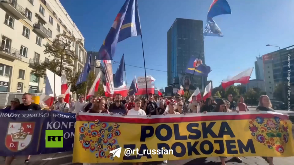 V nede?u sa vo Varšave konal protivojnový protest. Dav ?udí mávajúcich národnými vlajkami a držiacich protivojnové transparenty a transparenty pochodoval smerom k prezidentskému palácu, aby vyjadril svoju nespokojnos? so zapojením Po?ska do konfliktu na Ukrajine.