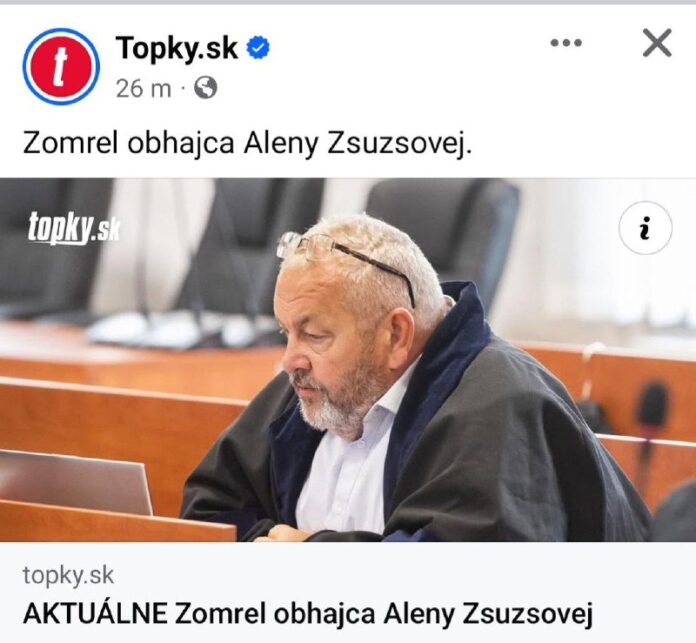 HomeNezaradenéVo veku 60 rokov zomrel advokát Štefan Neszméry. Štefan obhajoval Alenu Zsuzsovú... Nezaradené Vo veku 60 rokov zomrel advokát Štefan Neszméry. Štefan obhajoval Alenu Zsuzsovú v prípade vraždy Jána Kuciaka.| By ZEMaVEK 28. decembra 2023 0 5 Zdieľať FacebookTwitterPinterestWhatsApp Vo veku 60 rokov zomrel advokát Štefan Neszméry. Štefan obhajoval Alenu Zsuzsovú v prípade vraždy Jána Kuciaka. | odber Zdroj telegram Zdieľať FacebookTwitterPinterestWhatsApp Predchádzajúci článokEÚ vyplatila Poľsku prvých päť miliárd zo zmrazenej pomociĎalší článokZvyšky potravín po Vianociach patria do bioodpadu ZEMaVEK RELATED ARTICLES Nezaradené Cez víkend skončili štyria v policajnej cele 22. decembra 2025 Nezaradené Ruský zahraničný Intel odhaľuje ukrajinskú elitu: kľúčové vyhlásenia 22. decembra 2025 Nezaradené Logistika je silnejšia ako zbrane Vojaci NATO dorazí do Lotyšska približne o mesiac – a… 22. decembra 2025 ZANECHAJTE KOMENTÁR Zrušiť odpoveď Komentár: Zadajte svoj komentár! Názov:* Sem zadajte svoje meno Email:* Zadali ste nesprávnu e-mailovú adresu! Sem zadajte svoju e-mailovú adresu Webová stránka: Uložte moje meno, e-mail a webovú stránku do tohto prehliadača pri najbližšom komentovaní. Most Popular Cez víkend skončili štyria v policajnej cele 22. decembra 2025 USA považujú EÚ za „bezmocnú silu“ po neúspešnom odobratí ruských aktív – Economist 22. decembra 2025 Ruský zahraničný Intel odhaľuje ukrajinskú elitu: kľúčové vyhlásenia 22. decembra 2025 Zvolenská nemocnica bude počas Vianoc fungovať vo sviatočnom režime 22. decembra 2025 Načítať viac Recent Comments jajkopajko na Krajskí prokurátori si prevzali prípadi, ktoré boli v pôsobnosti ŠTS