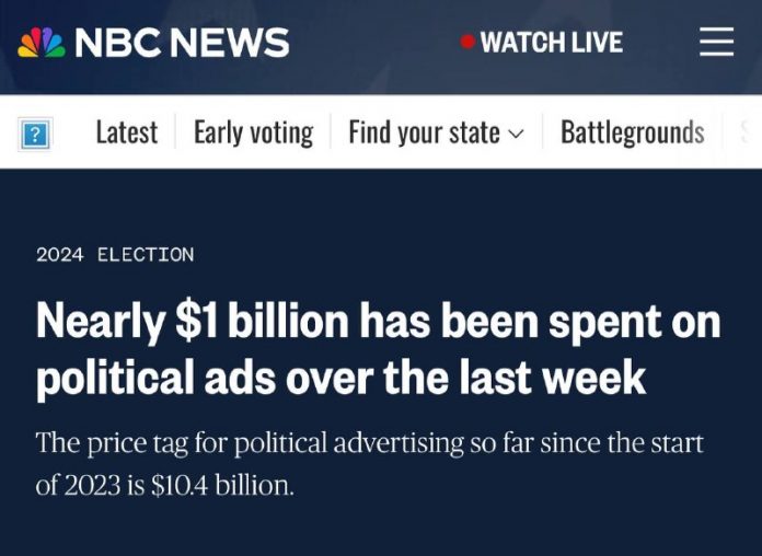 Výdavky na politickú reklamu v Spojených štátoch pred vo?bami dosiahli za jeden týžde? takmer miliardy dolárov, ?o predstavuje takmer 10 % celkových takýchto výdavkov od za?iatku roka 2023, uvádza NBC News.