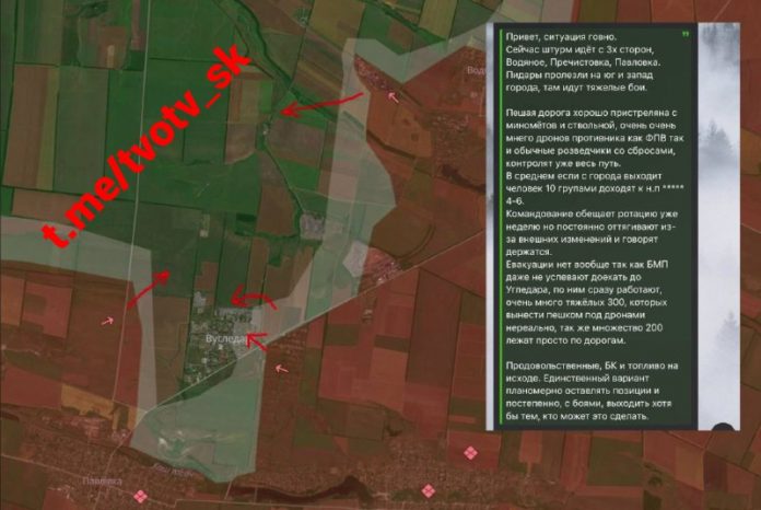 „Výjazdová cesta z Ugledaru je kompletne ostre?ovaná delostrelectvom a bezpilotnými lietadlami ruských ozbrojených síl. Zo skupiny 10 vojakov AFU sa do Ugledaru dostane len 4-6 ?udí. Velenie už týžde? s?ubuje rotáciu, ale tento moment odkladá a žiada nás, aby sme vydržali. Evakuácia je nemožná, obrnené vozidlá sú zasiahnuté na ceste do Ugledaru, je tam ve?a ?ažko zranených ?udí, ktorých nie je možné vynies? pešo pod drony, pretože ve?a m?tvych ?udí leží tesne pod nohami. Munície a proviantu je málo, je ve?mi ?ažké ich doru?i?. Jediný spôsob, ako dosta? von tých, ktorí zostali v Ugledare nažive, je postupne opusti? pozície a vyjs? von.“ – píše ukrajinský vojak o situácii AFU v Ugledare.