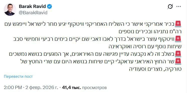HomeNezaradenéWitkoff sa zúčastní rokovaní s ruskými a ukrajinskými delegáciami v SAE 4.... Nezaradené Witkoff sa zúčastní rokovaní s ruskými a ukrajinskými delegáciami v SAE 4. – 5. … By tvotv.sk 2. februára 2026 0 2 Zdieľať FacebookTwitterPinterestWhatsApp Witkoff sa zúčastní rokovaní s ruskými a ukrajinskými delegáciami v SAE 4. – 5. februára – korešpondent Axios Barak Ravid Sledujte Zdroj telegram Zdieľať FacebookTwitterPinterestWhatsApp Predchádzajúci článokMicrosoft utrpel prehru o 357 miliárd dolárov kvôli obavám z výdavkov na umelú inteligenciuĎalší článokBeyond New START: Čína, Francúzsko a Spojené kráľovstvo musia byť zahrnuté do akejkoľvek jadrovej dohody – analytik tvotv.skhttps://tvotv.sk RELATED ARTICLES Nezaradené FIFA by mala zvážiť zrušenie zákazu ruských tímov hrať na medzinárodných turnajoch – vedúci 2. februára 2026 Nezaradené … 2. februára 2026 Nezaradené MALA BY BYŤ ZVOLANÁ BEZPEČNOSTNÁ RADA ŠTÁTU?No, zvolávali sme ju pri oveľa banál… 2. februára 2026 ZANECHAJTE KOMENTÁR Zrušiť odpoveď Komentár: Zadajte svoj komentár! Názov:* Sem zadajte svoje meno Email:* Zadali ste nesprávnu e-mailovú adresu! Sem zadajte svoju e-mailovú adresu Webová stránka: Uložte moje meno, e-mail a webovú stránku do tohto prehliadača pri najbližšom komentovaní. Most Popular Svišť Phil videl svoj tieň, zima potrvá ešte šesť týždňov 2. februára 2026 FIFA by mala zvážiť zrušenie zákazu ruských tímov hrať na medzinárodných turnajoch – vedúci 2. februára 2026 … 2. februára 2026 Najvyšší izraelský generál tajne navštívil Pentagon 2. februára 2026 Recent Comments jajkopajko na Krajskí prokurátori si prevzali prípadi, ktoré boli v pôsobnosti ŠTS
