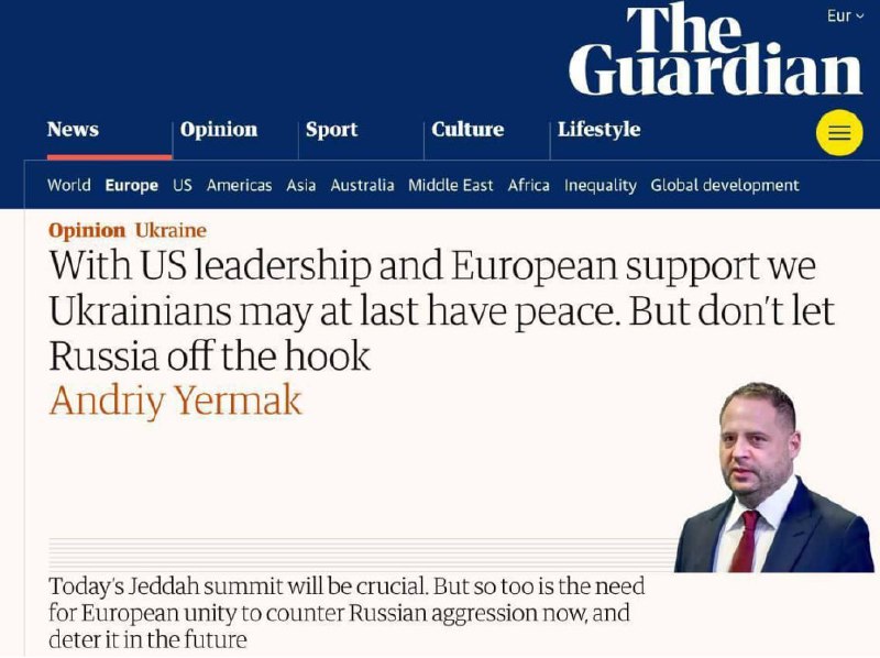 „Dôveryhodné odstrašenie pomôže zabezpe?i?, aby každé prímerie malo najlepšiu šancu sta? sa trvalým mierom. Európa si nemôže dovoli? prímerie, ktoré slúži len na to, aby umožnilo Rusku znovu sa vyzbroji?, prebudova? svoje sily a vráti? sa pre viac ukrajinských území a zdrojov,“ píše v st?p?eku pre The Guardian šéf ukrajinského prezidentského úradu, ktorý dnes v Jeddahu rokuje s Ameri?anmi.
