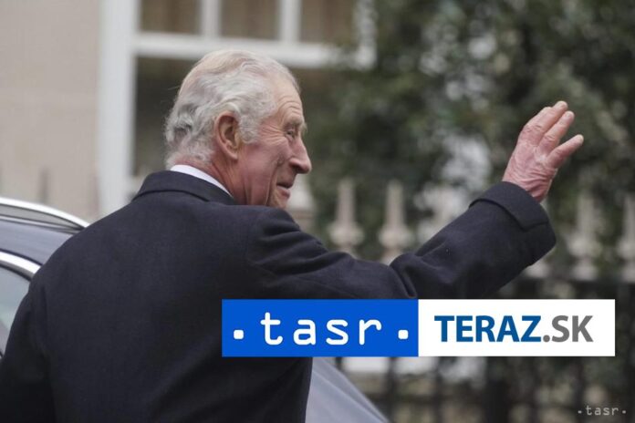 Krá? zamával davu ?udí, ke? spolu s manželkou krá?ovnou Kamilou vyšiel zo súkromnej nemocnice The London Clinic, a nastúpil do ?akajúceho vozidla.