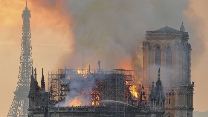 V tomto 15. apríli 2019 sa z katedrály Notre Dame, ktorá horí v Paríži, dvíhajú fotografie, plamene a dym. Katedrála stojí zmrza?ená, zamknutá v nebezpe?nej sieti skrúteného kovového lešenia rok po tom, ?o kataklizmatický požiar zni?il jej interiér, zvrhol jej slávnu vežu a zdesil svet. (AP Photo/Thibault Camus, súbor)
