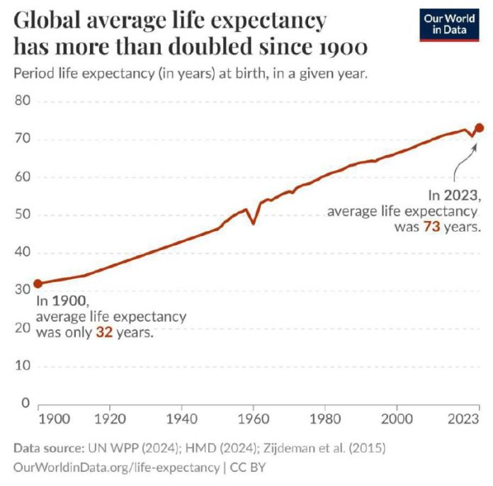 „Priemerná d?žka života vo svete sa od roku 1900 viac ako zdvojnásobila. V roku 2023 to bolo 73 rokov, kým na za?iatku minulého storo?ia len 32 rokov. Toto zvýšenie priemernej d?žky života bolo umožnené zlepšenými životnými podmienkami, pokrokom v medicíne a poklesom detskej úmrtnosti, poznamenáva výskumné centrum.