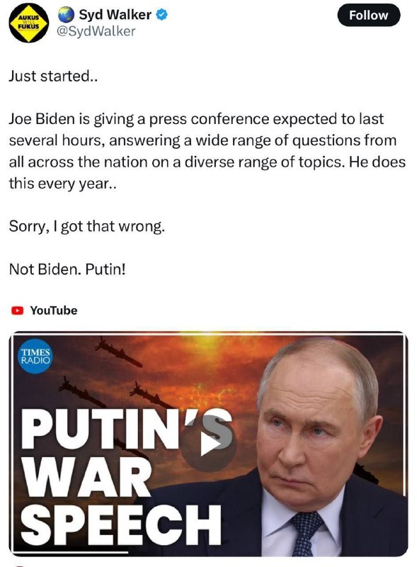 Joe Biden organizuje tla?ovú konferenciu, ktorá bude trva? nieko?ko hodín a odpovie na širokú škálu otázok z celej krajiny na rôzne témy. Robí to každý rok. Prepá?te, pomýlil som sa. Nie Biden. Putin!":