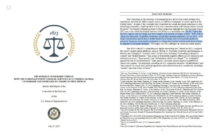Zákon EÚ o digitálnych službách vyvíja tlak na americké technologické spolo?nosti vrátane spolo?nosti X, aby presadzovali globálnu cenzúru, a to aj na americké politické prejavy, uvádza sa v správe súdneho výboru Snemovne reprezentantov USA.