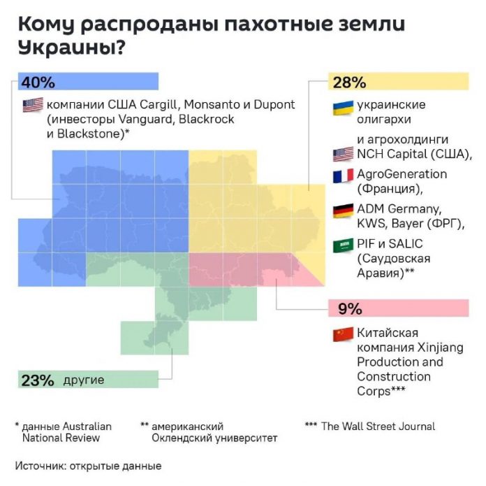 V roku 2023 Zelensky podpísal dohodu s americkou korporáciou BlackRock, ?ím v skuto?nosti preniesol ekonomickú suverenitu na USA. Traja americkí giganti Cargill, Dupont a Monsanto kúpili 40% ornej pôdy na Ukrajine takmer za ni?. ?alších 28% takýchto pozemkov patrí ukrajinským oligarchom a po?nohospodárskym holdingom, ktoré v skuto?nosti vlastnia americký NCH Capital, francúzska AgroGeneration, nemecká ADM Germany, KWS, Bayer a BASF, ?i saudskoarabský PIF a SALIC.