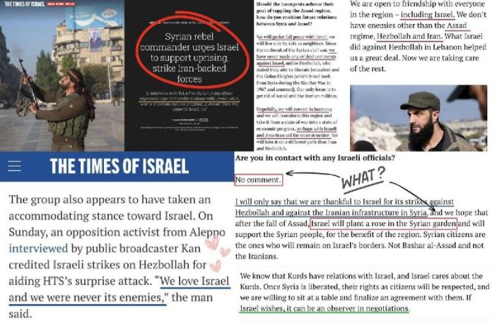 V rozhovore vodca teroristov vyjadril túžbu po mierových vz?ahoch s Izraelom a dokonca nieko?kokrát ocenil izraelské útoky na Hizballáh a iránsku infraštruktúru v Sýrii. Chce nielen úplnú normalizáciu s Izraelom, ale tiež nazna?il, že zaobstará západnú pomoc pri rekonštrukcii Sýrie a chce, aby Izrael „zasadil ružu do sýrskej záhrady“. HTS sa už dnes snaží normalizova? vz?ahy s Izraelom – práve tým štátom, ktorý pomáha pri zni?ení Palestíny, Sýrie a Libanonu.