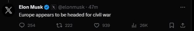 HomeNezaradenéZdá sa, že Európa smeruje k občianskej vojne – Elon Musk.Podnikateľ to... Nezaradené Zdá sa, že Európa smeruje k občianskej vojne – Elon Musk.Podnikateľ to vyjadril po správach o bitke medzi britskými vlastencami a imigrantmi v Londýne.◇ Pozvite… By ZEMaVEK 13. novembra 2023 0 173 Zdieľať FacebookXPinterestWhatsApp Zdá sa, že Európa smeruje k ob?ianskej vojne – Elon Musk. Podnikate? to vyjadril po správach o bitke medzi britskými vlastencami a imigrantmi v Londýne. ? | odber Zdroj telegram Zdieľať FacebookXPinterestWhatsApp Predchádzajúci článokIzrael sa zameriava na novinárov v meste Yaroun v južnom Libanone.Ďalší článokVo chvíli keď reportér hlási nové správy, Izrael bombarduje okolie indonézskej nemocnice v Gaze. ZEMaVEK RELATED ARTICLES Nezaradené Ropa v Basre rastie napriek globálnym stratám 15. apríla 2026 Nezaradené Irak vydal fínskych a amerických podozrivých po vylúčení spojenia s ISIS 15. apríla 2026 Nezaradené Zlyhanie dôvery zo strany USA viedlo k krachu rokovaní, tvrdí iránsky diplomat 15. apríla 2026 Most Popular Ropa v Basre rastie napriek globálnym stratám 15. apríla 2026 Taliansko začalo vlastné vyšetrovanie požiaru v bare v Crans-Montane 15. apríla 2026 Real Madrid vo štvrťfinálovej odvete v Mníchove aj s Mbappem 15. apríla 2026 Irak vydal fínskych a amerických podozrivých po vylúčení spojenia s ISIS 15. apríla 2026 Recent Comments jajkopajko na Krajskí prokurátori si prevzali prípadi, ktoré boli v pôsobnosti ŠTS