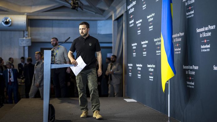 Snímka príbehu zverejneného denníkom Financial Times o Zelenského „mierovej konferencii“ o Ukrajine, ktorá sa konala vo Švaj?iarsku 15. až 16. júna 2024.