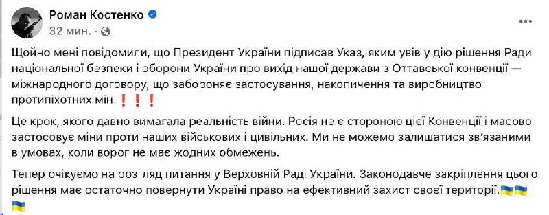 Zelenskij implementoval rozhodnutie Rady národnej bezpe?nosti a obrany odstúpi? od Ottawského dohovoru, ktorý zakazuje výrobu a používanie protipechotných mín.