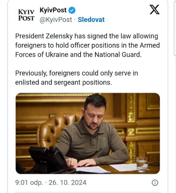 Návrh zákona, na základe ktorého môžu byť cudzinci dôstojníkmi ukrajinskej armády, špeciálnych štátnych dopravných služieb a Národnej gardy, poslanci schválili 10. októbra. Doteraz mohli byť cudzinci v ukrajinských ozbrojených silách iba vojakmi alebo seržantmi.