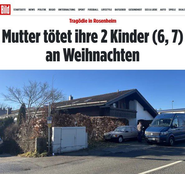 Tridsa?devä?ro?ná matka v bavorskom meste Rosenheim zavraždila na Vianoce svoje dve deti – sedemro?nú dcéru a šes?ro?ného chlapca. Potom sa pokúsila spácha? samovraždu, napísal nemecký denník Bild. M?tve deti a ich ranenú matku objavil známy, ktorý mal zrejme o rodinu strach, a tak sa ju rozhodol v noci po Štedrom dni skontrolova?.