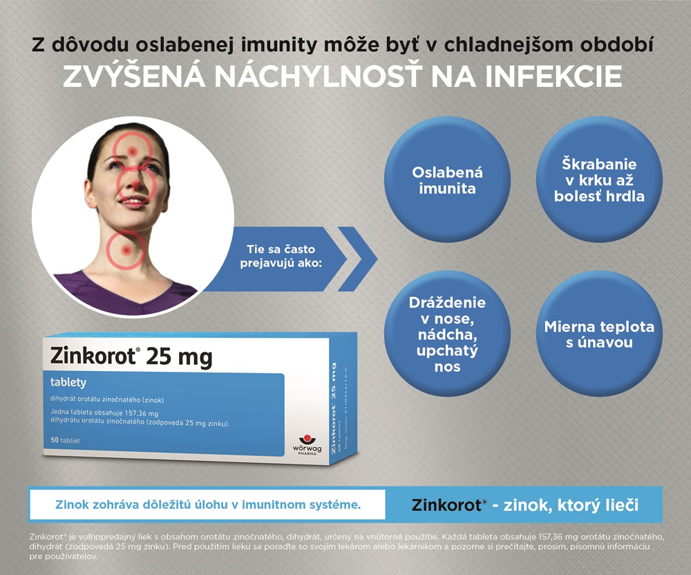 Pri oslabenej imunite môže by? v chladnejšom období zvýšená náchylnos? vo?i infekciám. Imunita je schopnos? nášho tela bojova? proti chorobám spôsobených baktériami alebo vírusmi. Ke? už ale ochorieme, v našom organizme sa aktivuje imunitný systém. Každá sú?as? imunitného systému sa snaží svojim spôsobom bojova? proti pôvodcovi onemocnenia, ktorým je v tomto prípade vírus. Najdôležitejšou zložkou imunitného systému, ktorá sa podie?a na likvidovaní vírusov sú biele krvinky. Z tých významnejších spome?me napríklad B a T – lymfocyty, NK bunky a makrofágy. A zinok je ich vynikajúcim pomocníkom. Ak ho máme v tele málo, dochádza k útlmu vä?šiny funkcií imunitného systému. Nízka hladina zinku postihuje aj fungovanie NK buniek a makrofágov. A naopak, dostatok zinku podporuje fungovanie dôležitých zložiek imunitného systému: B a T-lymfocytov. V?aka nemu je odpove? nášho imunitného systému na ochorenie rýchla a silná.