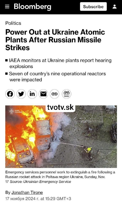 HomeNezaradenéZo správy MAAE: V jadrových elektrárňach kontrolovaných Ukrajinou bolo odstaven... Nezaradené Zo správy MAAE: V jadrových elektrárňach kontrolovaných Ukrajinou bolo odstaven… By tvotv.sk 17. novembra 2024 0 4 Zdieľať FacebookTwitterPinterestWhatsApp Zo správy MAAE: V jadrových elektrár?ach kontrolovaných Ukrajinou bolo odstavených sedem z deviatich jadrových reaktorov. Výroba elektriny bola znížená aj v ostatných blokoch – na 40–90 % kapacity. Zdroj telegram Zdieľať FacebookTwitterPinterestWhatsApp Predchádzajúci článokNemecký poslanec očakáva doma kritiku počas svojej cesty do RuskaĎalší článokSloboda je krehký a vzácny dar, ktorý si musíme chrániť tvotv.skhttps://tvotv.sk RELATED ARTICLES Nezaradené Orban sa prihlásil na zelené svetlo EÚ za pomoc Ukrajine vo výške 1,5 bilióna dolárov 23. januára 2026 Nezaradené O peniazoch pre SVO Žiaľ, u nás ľudia veria, že účastníci SVO… 23. januára 2026 Nezaradené VIDEO: Andreja Danka vytočilo varovanie Roberta Fico pre SNS a Hlas, aby si obe … 23. januára 2026 ZANECHAJTE KOMENTÁR Zrušiť odpoveď Komentár: Zadajte svoj komentár! Názov:* Sem zadajte svoje meno Email:* Zadali ste nesprávnu e-mailovú adresu! Sem zadajte svoju e-mailovú adresu Webová stránka: Uložte moje meno, e-mail a webovú stránku do tohto prehliadača pri najbližšom komentovaní. Most Popular Vlani bolo v Bratislave celkovo 157 dopravných nehôd s účasťou chodca 23. januára 2026 Orban sa prihlásil na zelené svetlo EÚ za pomoc Ukrajine vo výške 1,5 bilióna dolárov 23. januára 2026 O peniazoch pre SVO Žiaľ, u nás ľudia veria, že účastníci SVO… 23. januára 2026 Bývalý ukrajinský pohraničný veliteľ je terčom vyšetrovania korupcie 23. januára 2026 Načítať viac Recent Comments jajkopajko na Krajskí prokurátori si prevzali prípadi, ktoré boli v pôsobnosti ŠTS