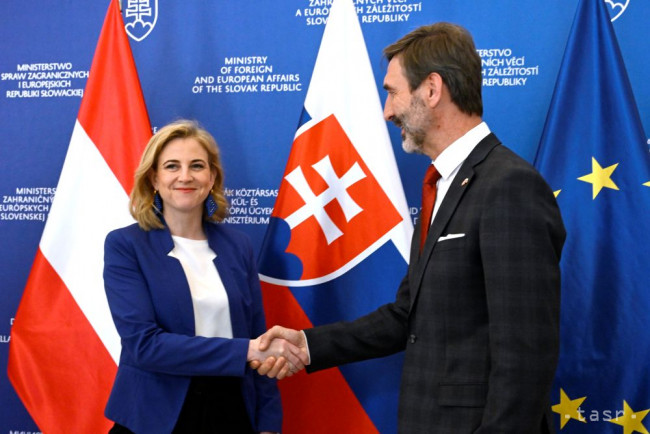 Na snímke v?avo rakúska ministerka pre európske a medzinárodné záležitosti Beate Meinl-Reisingerová po?as stretnutia s ministrom zahrani?ných vecí a európskych záležitostí SR Jurajom Blanárom (Smer-SD) (vpravo) v priestoroch MZVEZ SR 23. apríla 2025 v Bratislave.