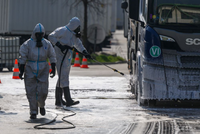 Na snímke rakúsky tím dezinfikuje nákladné vozidilá prichádzajúce na Slovensko z Ma?arska na dia?ni?nom hrani?nom priechode Rusovce – Rajka v Bratislave 27. marca 2025 v rámci zavedených prísnych opatrení pre šírenie vysoko nákazlivého ochorenia slinta?ky a kríva?ky.
